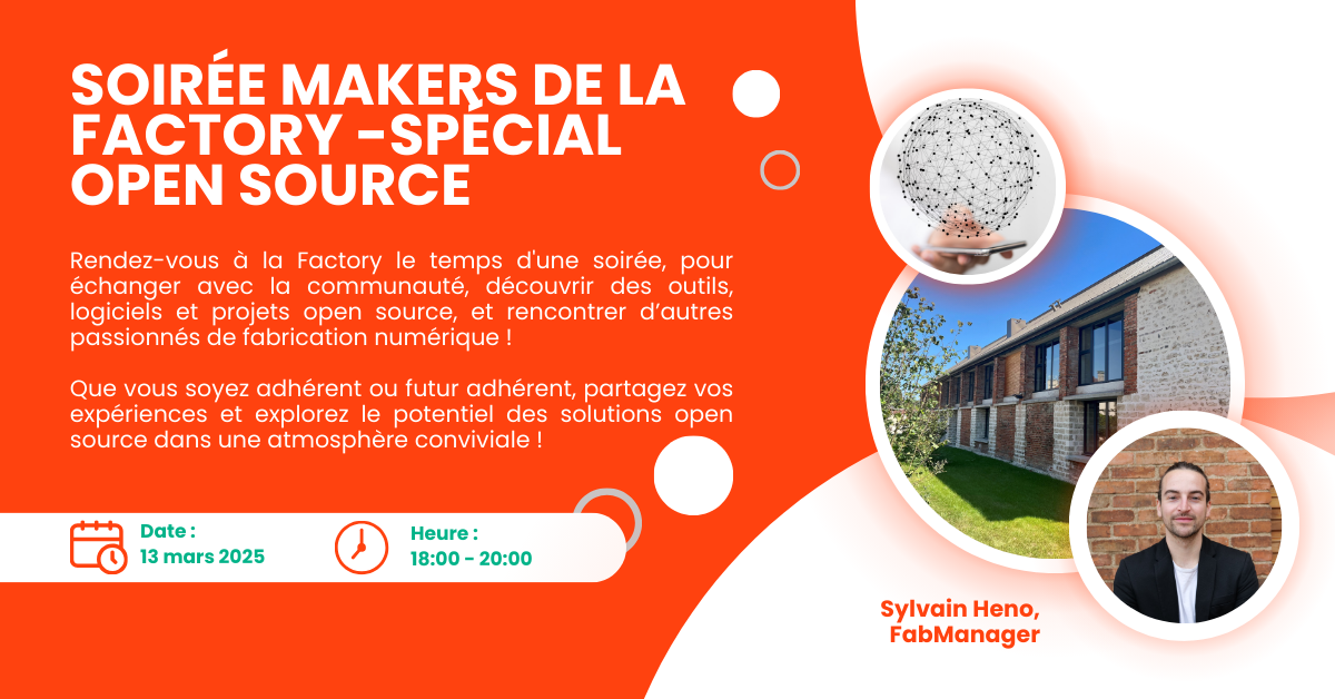 L’Open Source est une source d’innovation et de collaboration infinie ! Venez échanger et découvrir des solutions libres et innovantes lors de cette Soirée Makers ouverte aux adhérents et futurs adhérents de la Factory. Cette soirée sera l’occasion de découvrir des outils et solutions Open Source inspirants, d’échanger avec la communauté des Makers et de développer votre réseau autour d’un moment convivial 🍻